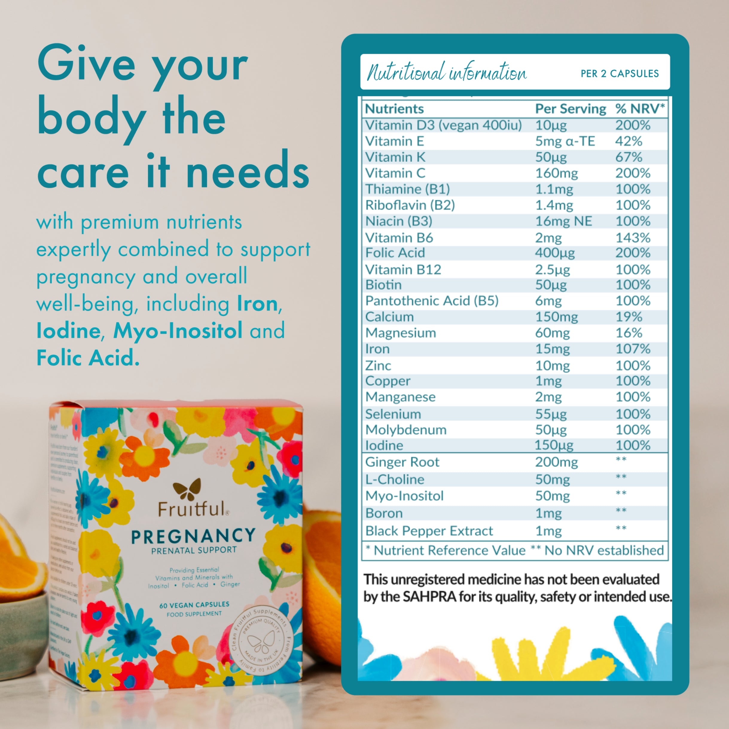 Fruitful® Pregnancy – Prenatal Support provides essential vitamins, minerals and botanicals to nourish you and your baby at every stage. Clean, vegan and additive-free for a healthy pregnancy.